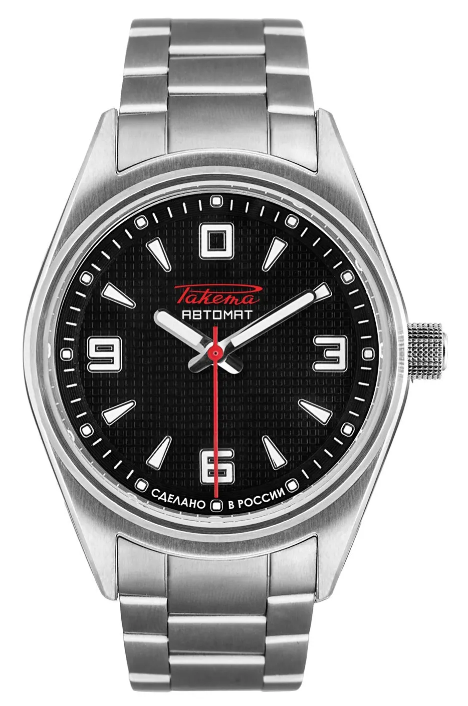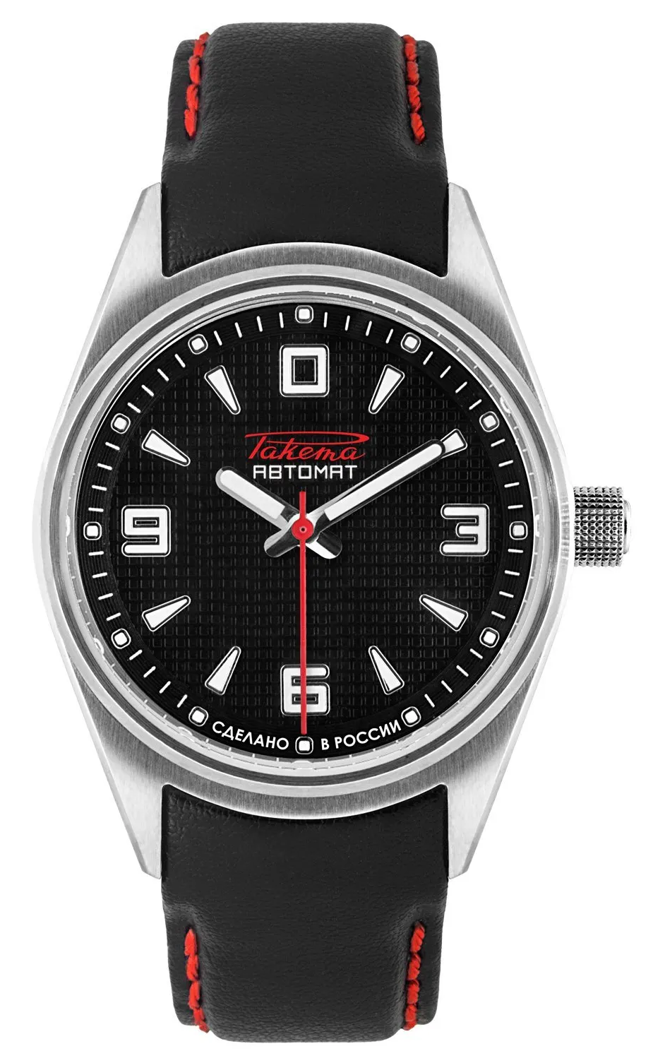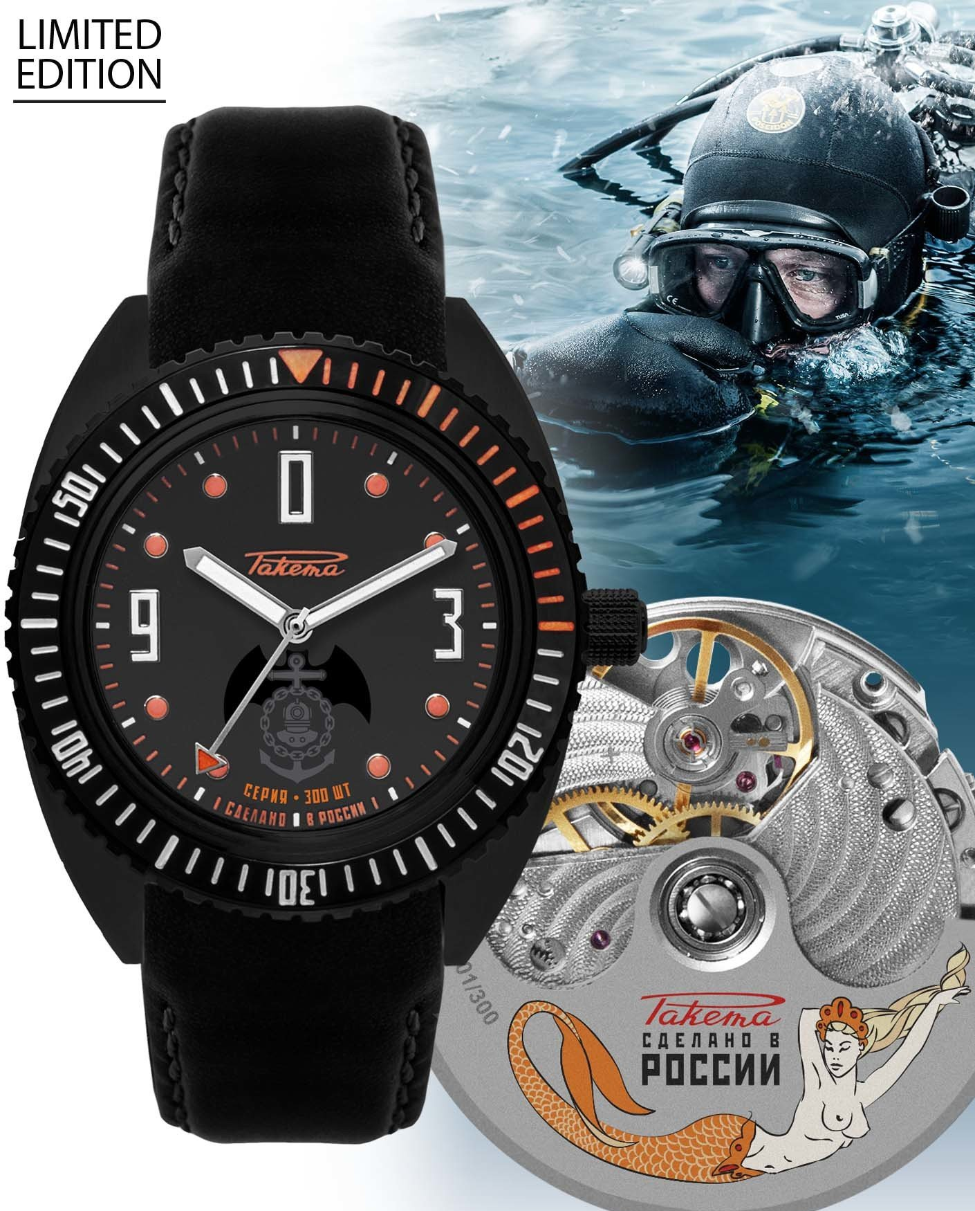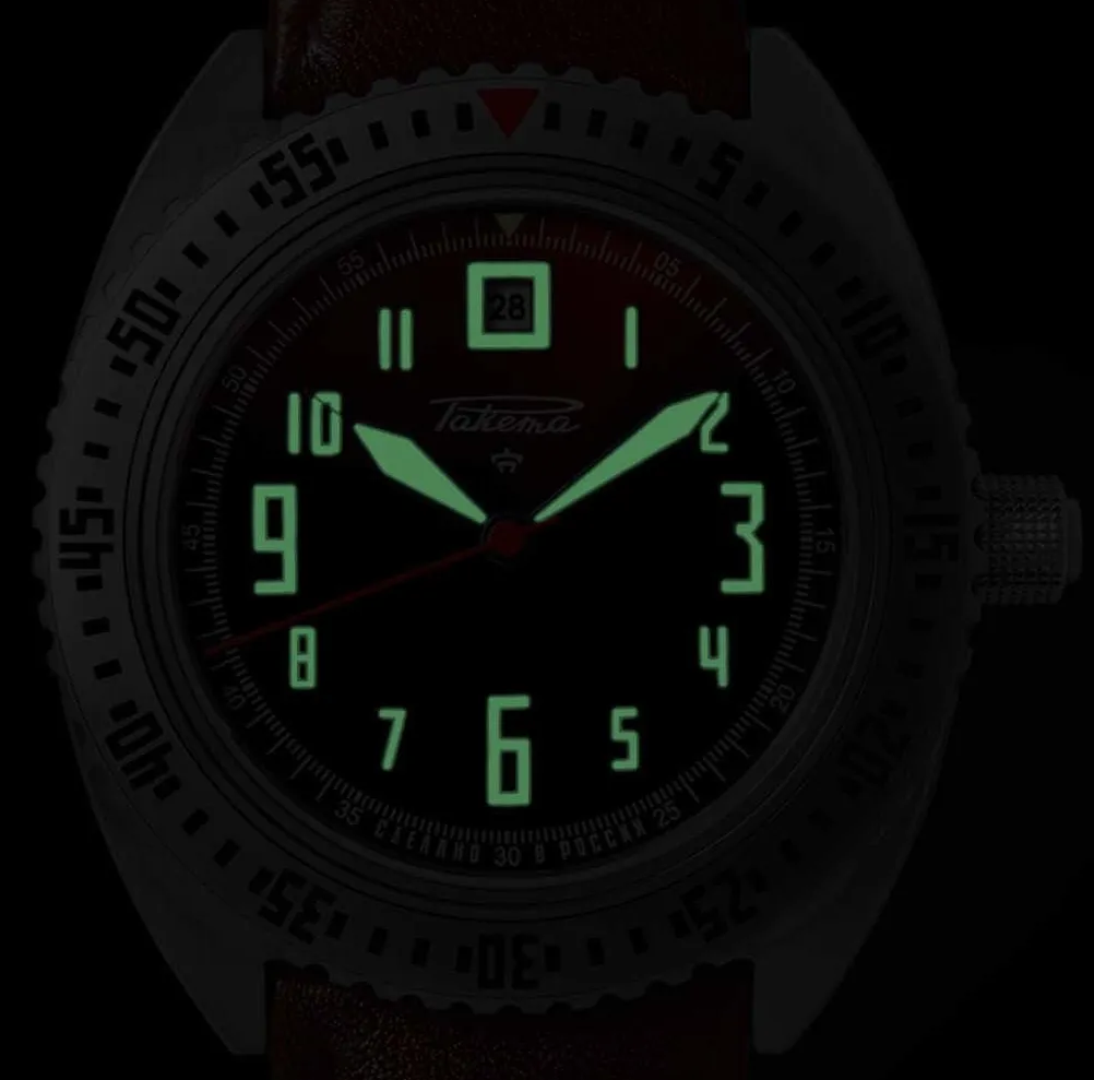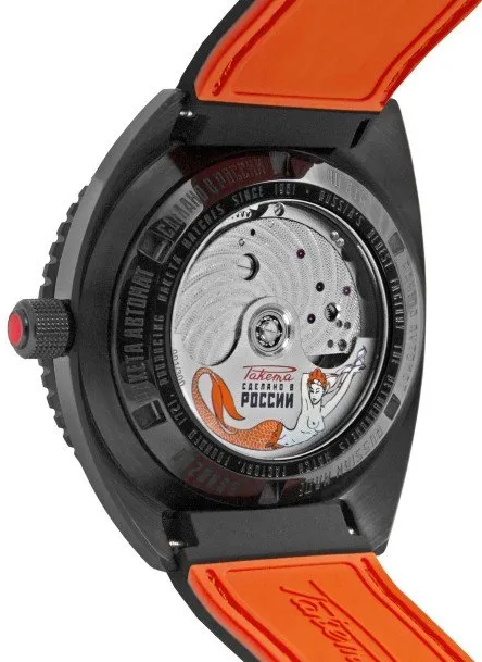 Calibre Avtomat 2615, cadran noir, chiffres et aiguilles luminescents. Boîtier acier 38,8mm, verre saphir, fond transparent. Prix: épuisé!