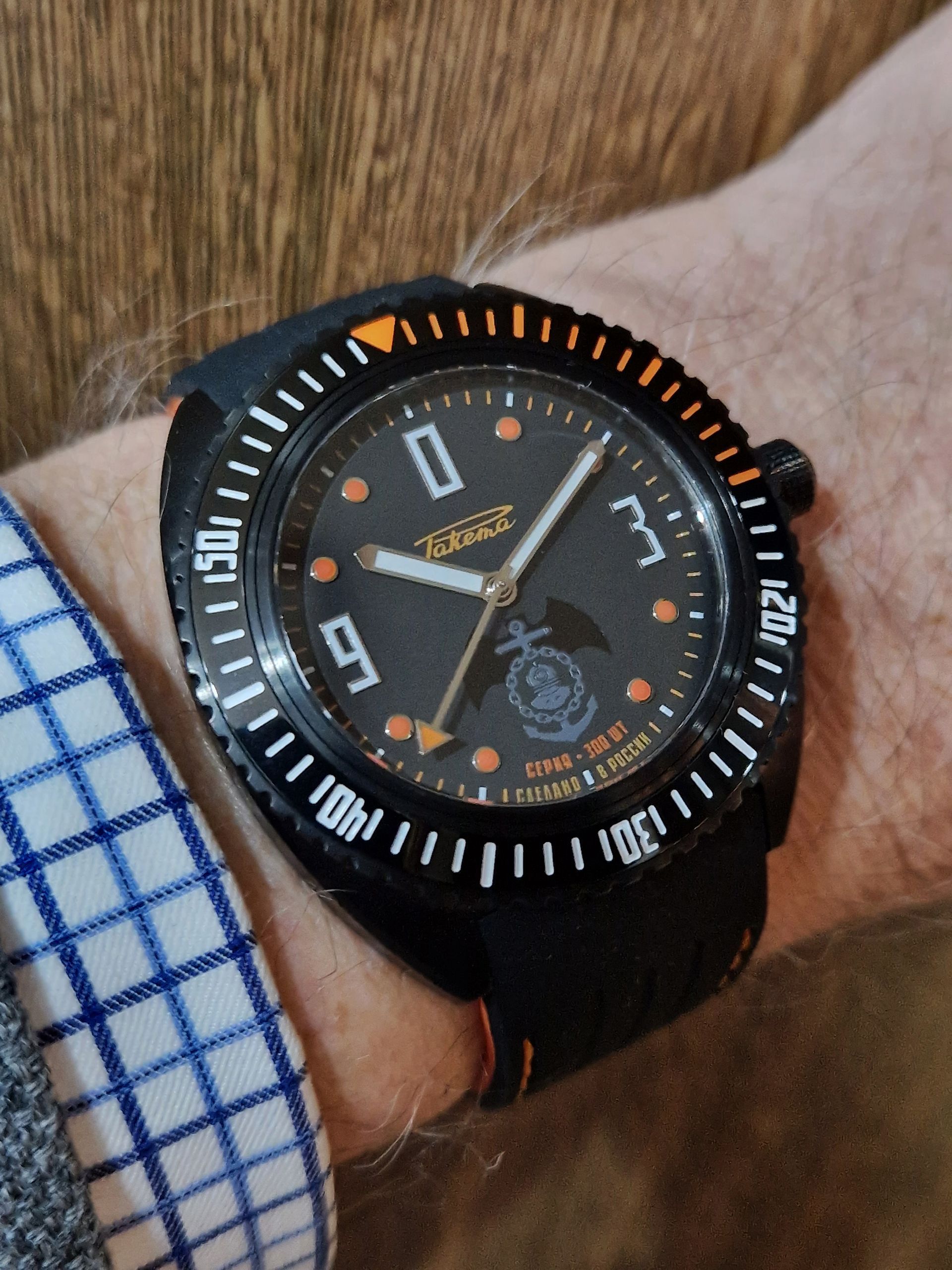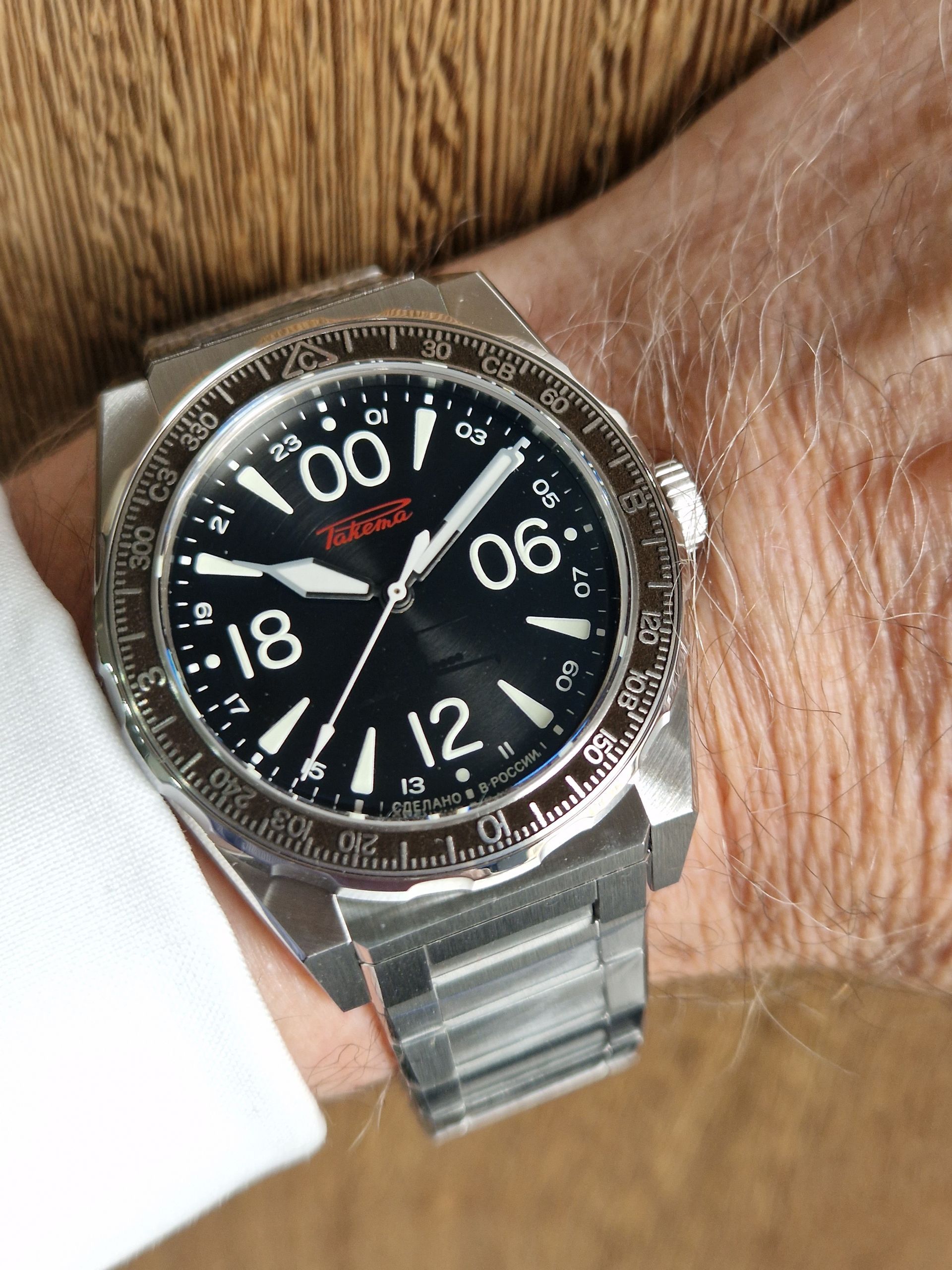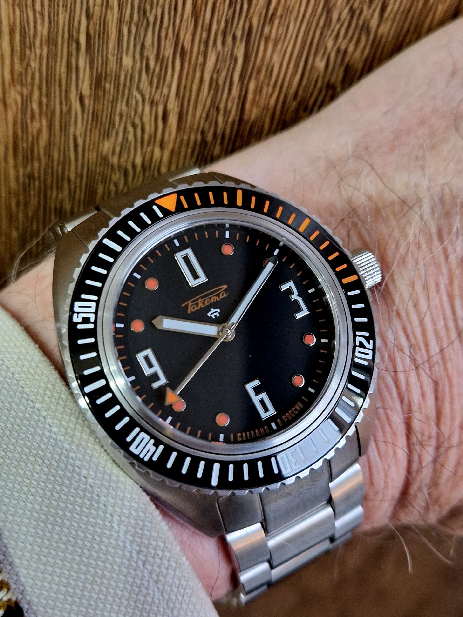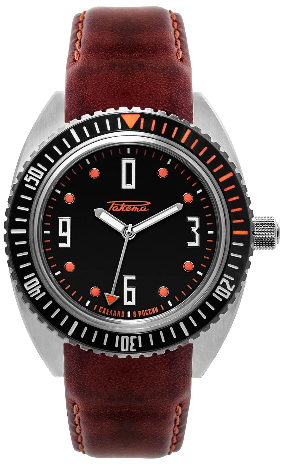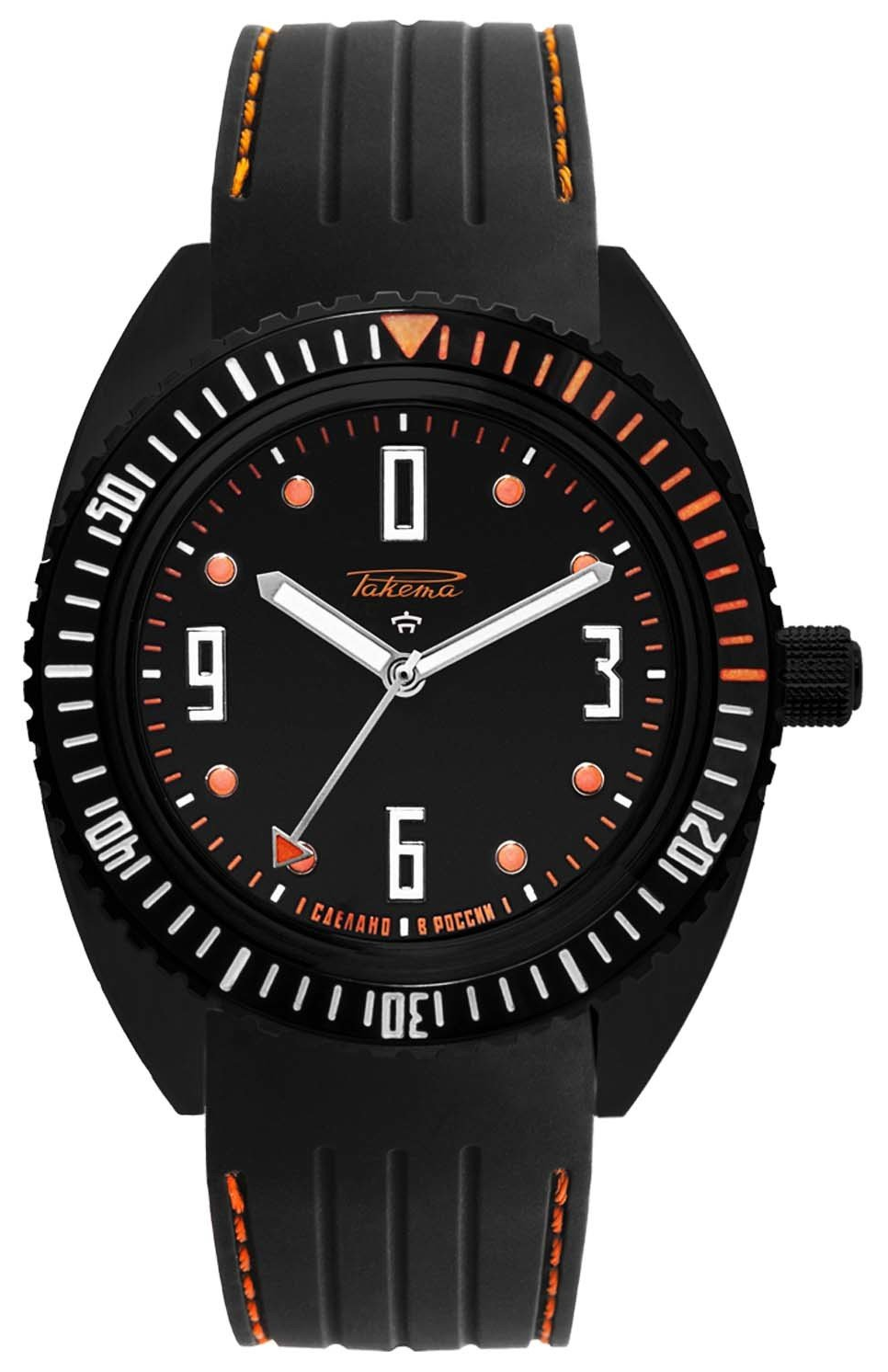 Calibre Avtomat 2615, cadran noir, chiffres et aiguilles luminescents. Boîtier acier 38,8mm, verre saphir, fond transparent. Prix: épuisé!
