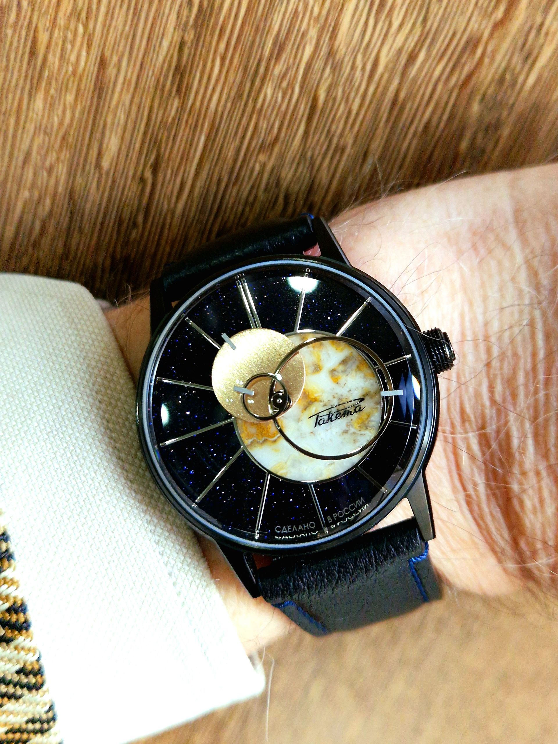 Le "ciel" en aventurine bleue est étoilé, mais le "soleil" en agate varie sensiblement d'une montre à l'autre!