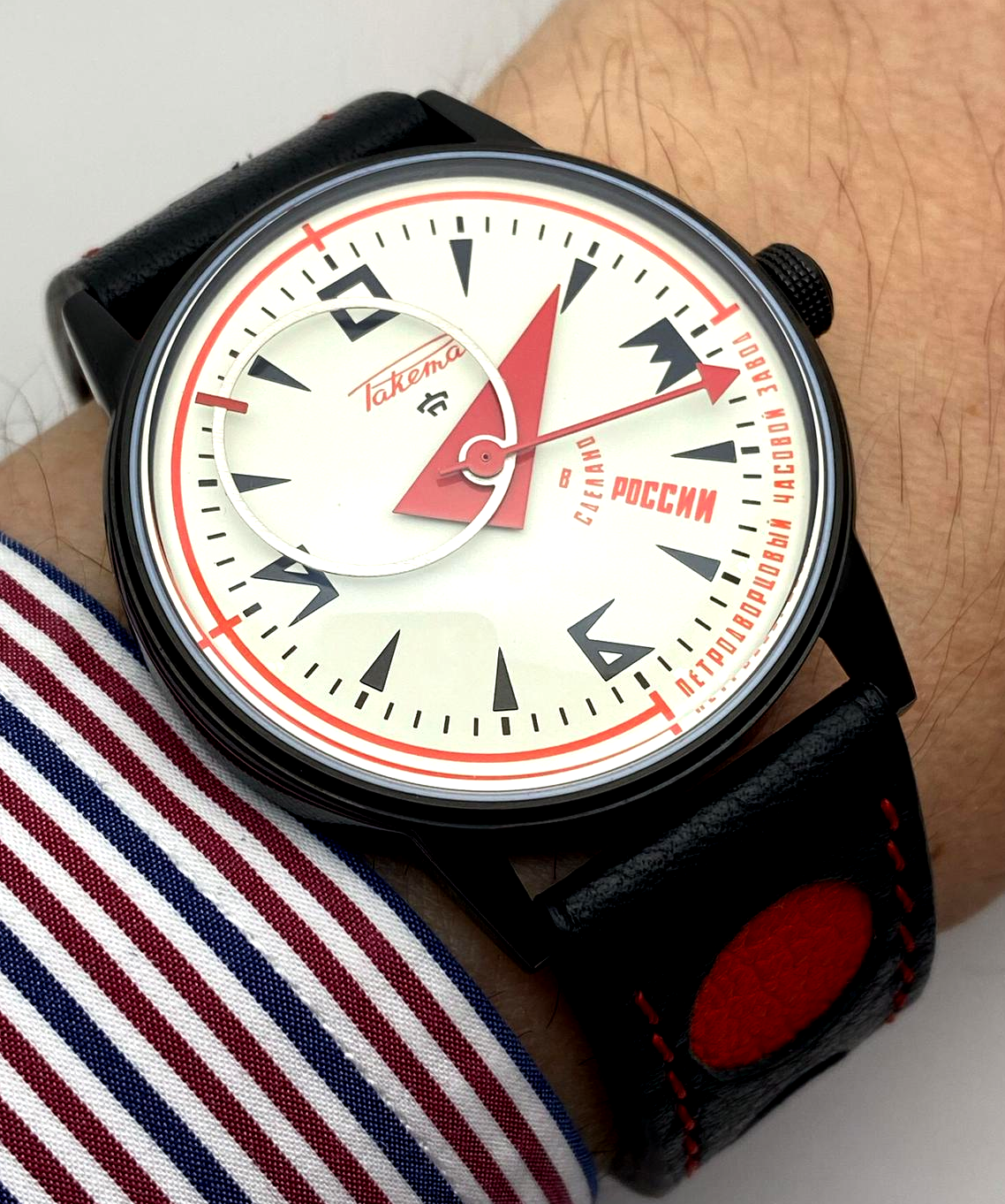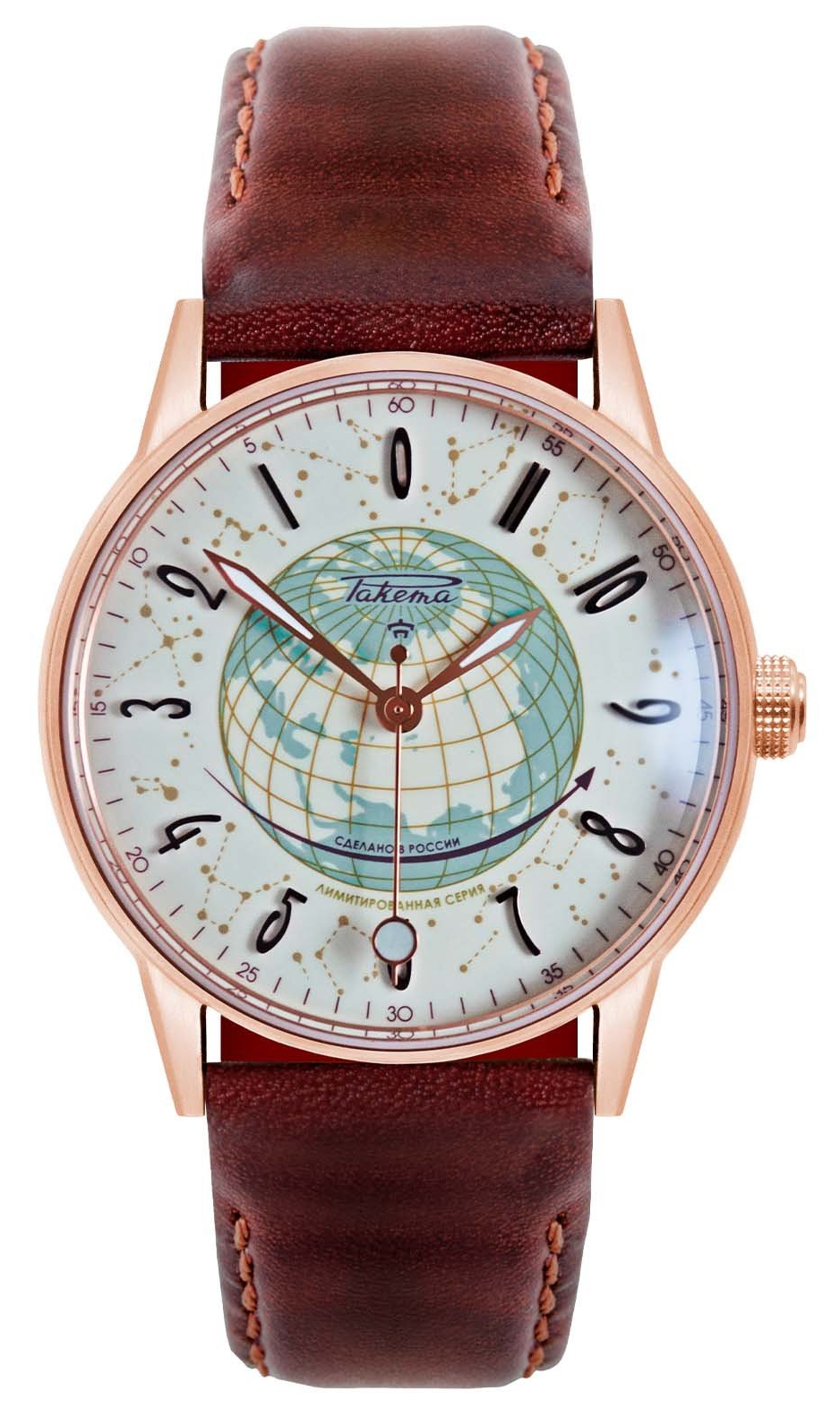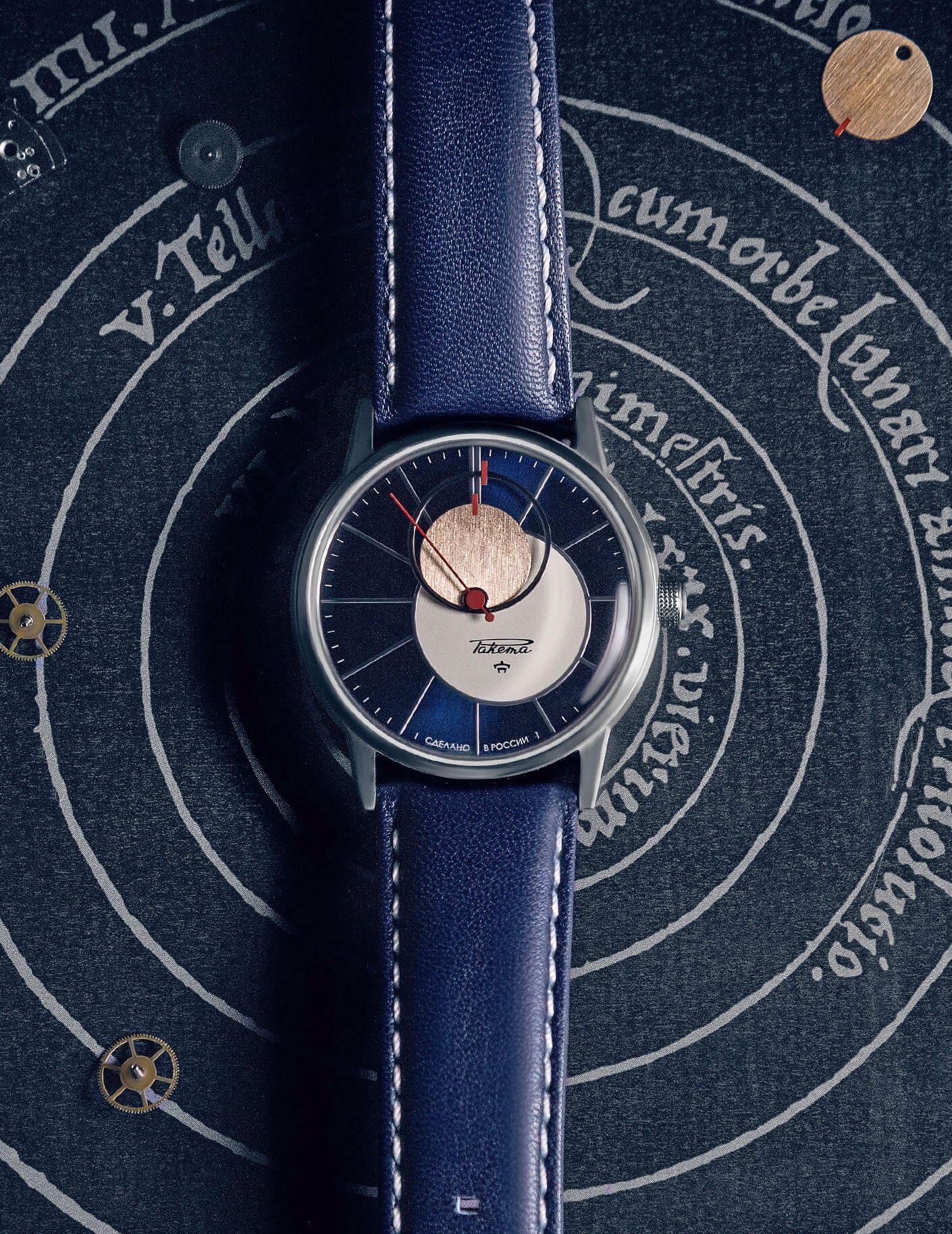 La montre Raketa “Russian Code” reproduit ce mouvement naturel des astres dans l’Univers en faisant tourner toutes les aiguilles à l'envers du sens habituel et souligne ainsi que la lecture usuelle du temps n’est pas nécessairement la plus juste !
