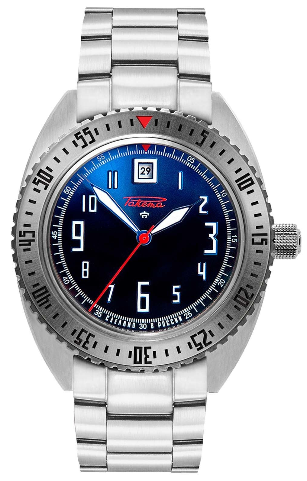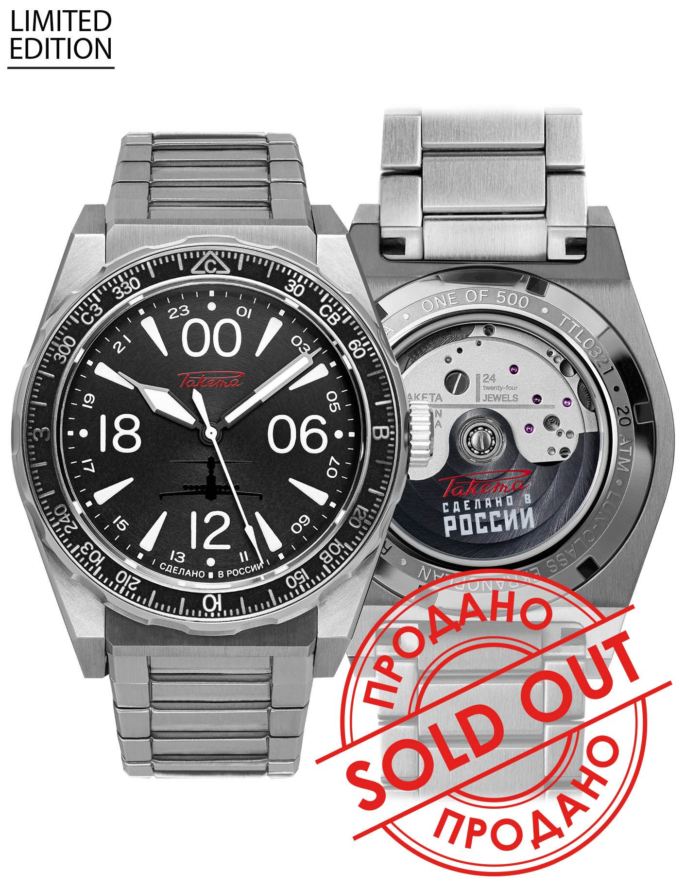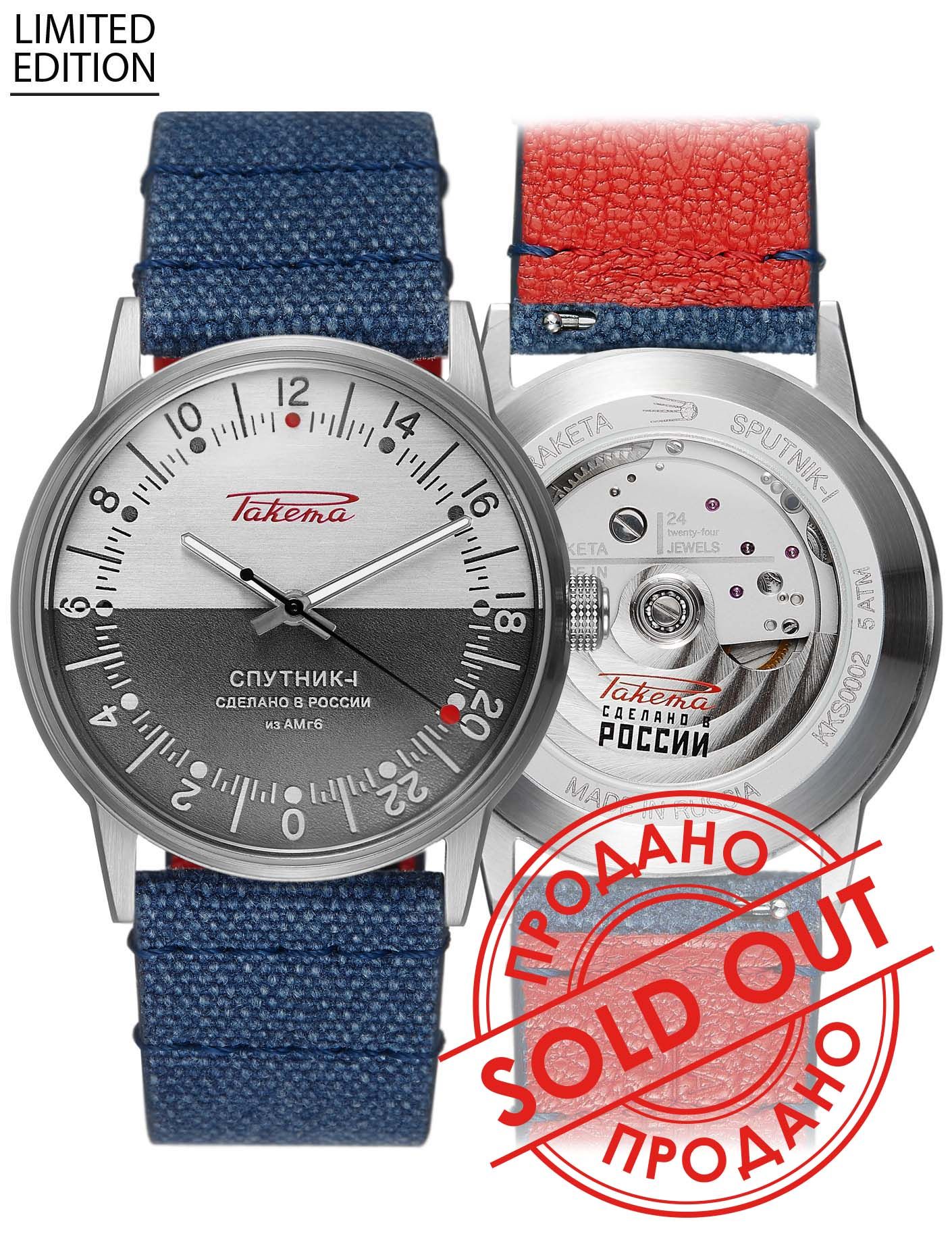 Le modèle est également disponible dans un coffret cadeau qui comprend : le modèle de la montre avec un bracelet en acier inoxydable, un bracelet supplémentaire en toile avec une doublure en cuir véritable et un magnifique modèle du satellite Sputnik-1. Epuisé!