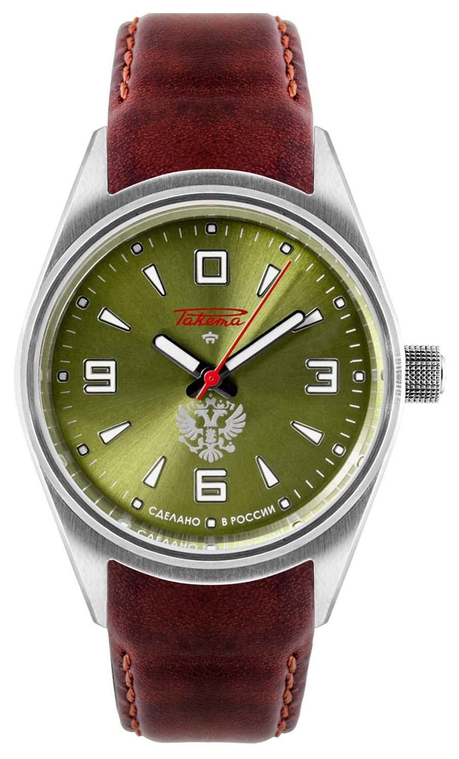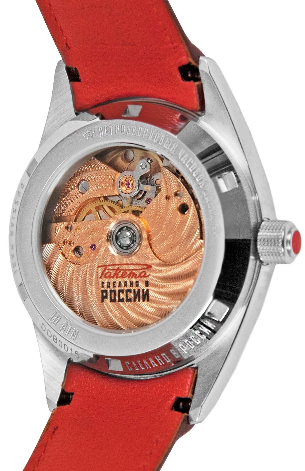 Vous verrez à travers le fond du boîtier un mouvement automatique décoré, entièrement fabriqué et assemblé à la manufacture horlogère Raketa de Saint-Pétersbourg.