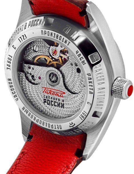Le fond du boîtier permet de découvrir le mouvement automatique 24 heures Raketa, entièrement fabriqué par la manufacture horlogère Raketa de Saint-Pétersbourg.
