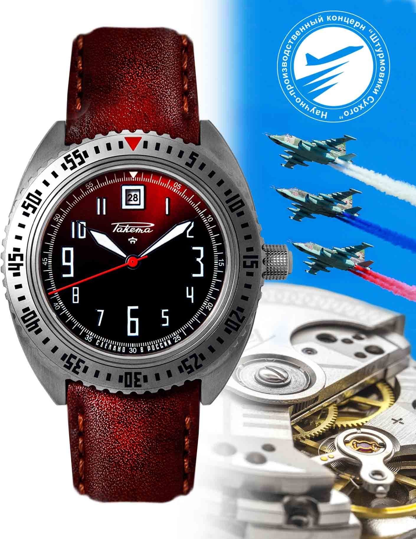 Le géant de l’aéronautique russe “Sukhoi” s’est adressé aux horlogers de la Manufacture Horlogère “Raketa” pour concevoir une montre pour les pilotes de l’avion d’assaut russe Su-25. Cette collaboration a abouti à la montre Raketa “Sukhoï” qui résiste aux variations extrêmes du facteur de charge en vol à bord du légendaire Su-25. Sur ce nouveau calibre Avtomat 2616 avec date, celle-ci apparaît sur le cadran dans une fenêtre à l’intérieur du fameux "zéro", signe distinctif des montres “Raketa”. Le boîtier de la montre en acier inoxydable d'un diamètre de 43 mm, est doté d’une lunette rotative et d’un verre en saphir résistant aux rayures, ainsi que d'un fond vissé transparent. Il est étanche à 200 mètres et est une couronne vissée.