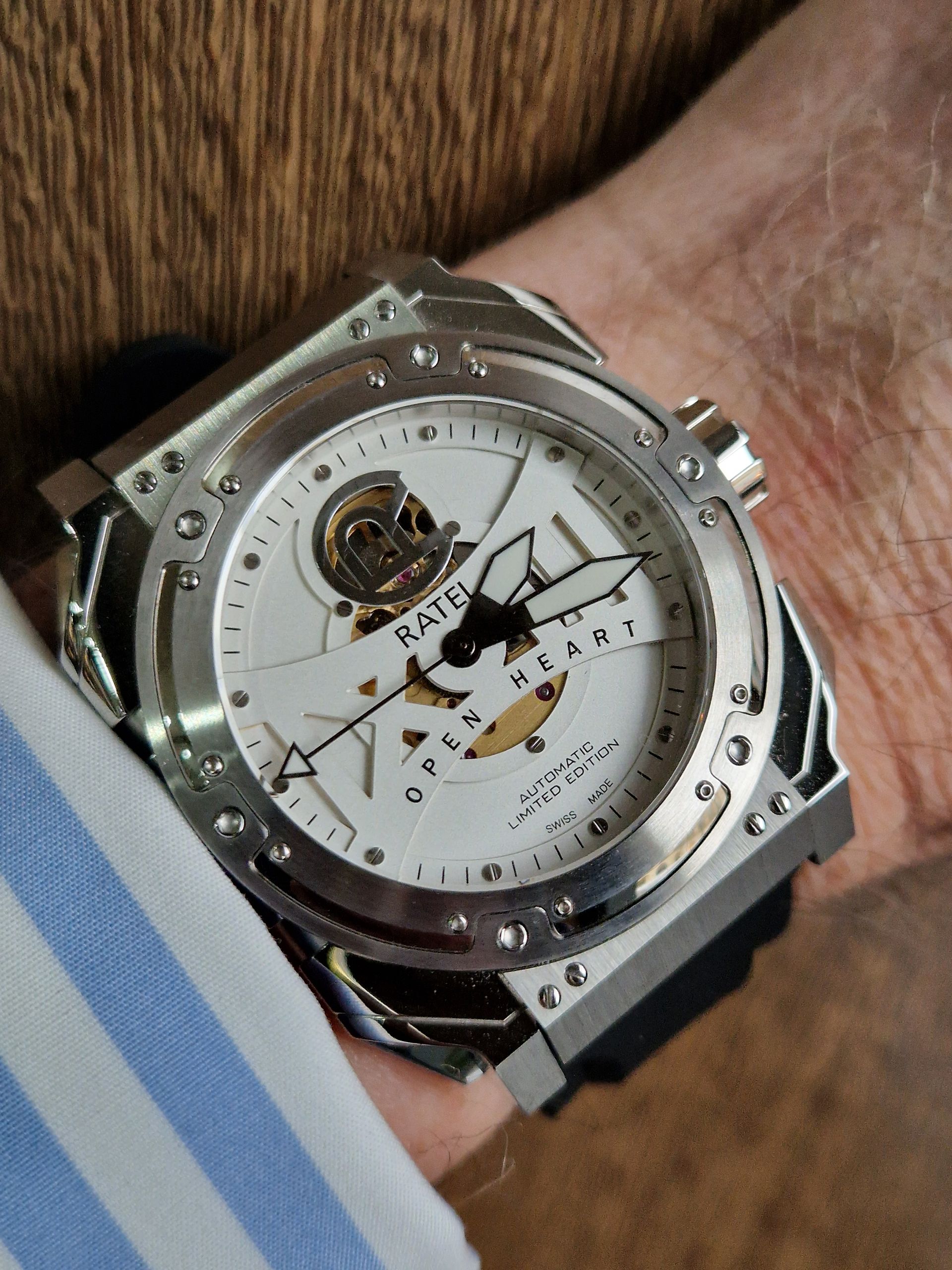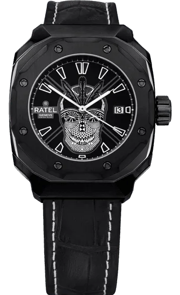 Boitier acier PVD noir, 41 mm, lunette vissée par 8 vis, verre saphir anti-reflets, fond transparent, mouvement automatique classique, cadran noir avec une tête de mort imprimée/gravée, sur bracelet cuir noir avec boucle déployante. Prix 2400 € TTC, sur demande.